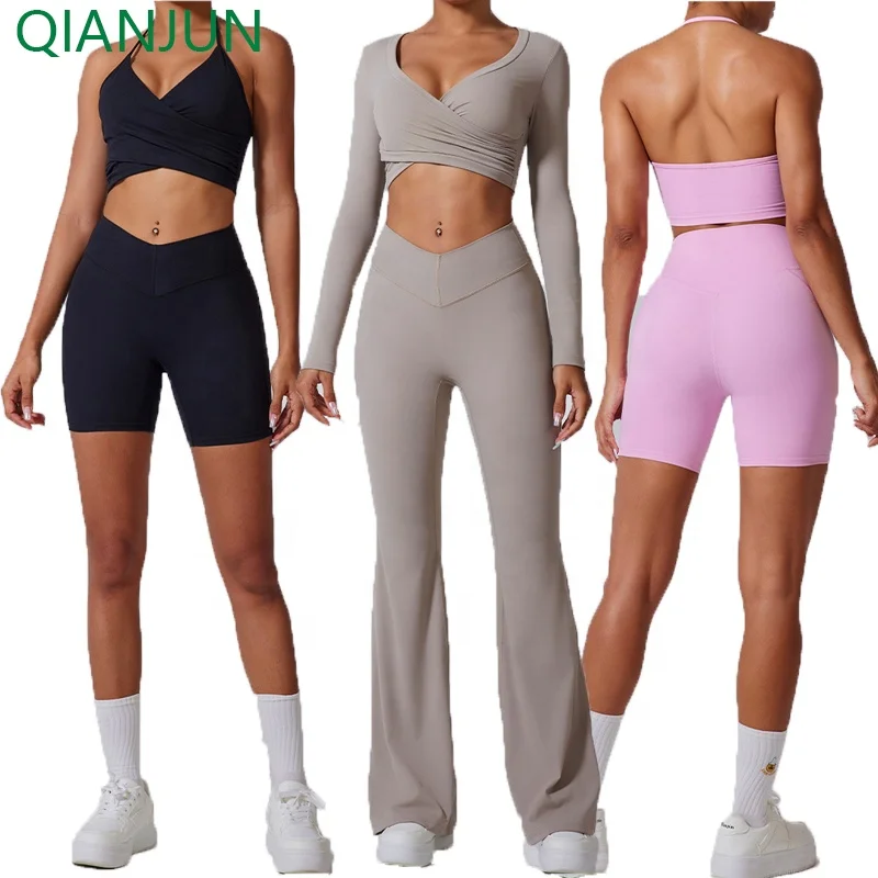 Wholesale Sports Long Sleeve Crop Top Flared Workout Leggings Yoga Active Wear Running Gym Fitness Sets